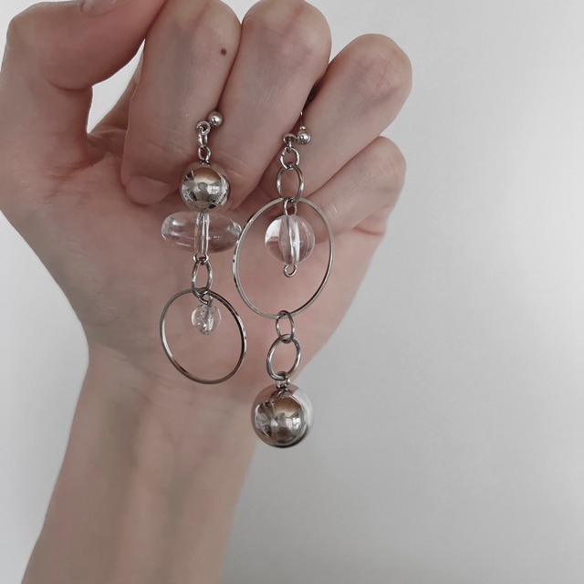 〜Renewal〜 クリア×シルバー ビーズの大きさ下がり方が 左右非対称になっているデザイン。 ◯サイズ...約6.5×2.5cm以内(左右で若干差アリ) ーーー ●ご注文の際にご注文の際にオプションから金具をご指定ください。 ●選択可能なパーツ以外のアレルギー対応パーツ(チタンや樹脂イヤリングなど) をご希望の方はご注文の前にメッセージからお問合せください。 ●アレルギー対応材質の金具パーツは、ご着用時に直接お肌に触れる部分のパーツのみを使用しております。 その他ビーズやチャーム等には別材質も使用しておりますので、着けたままのご入浴や海水浴はお控えください。 (ピアスやイヤリング部分のみ)